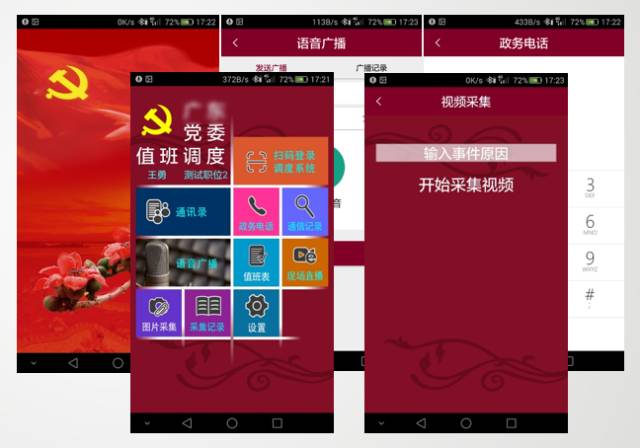 移動調(diào)度APP根據(jù)不同手機(jī)使用者的權(quán)限,實現(xiàn)對通訊錄功能、政務(wù)電話、語音通播、現(xiàn)場視頻采集功能、現(xiàn)場照片\錄音采集功能、查看值班室通信記錄、執(zhí)行值班表管理。