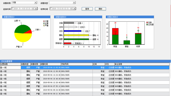 當下各類傳感器已經(jīng)進入我們的生活,很多環(huán)境的檢測告警都已通過傳感器實現(xiàn),申甌校園智控“云”系統(tǒng)融合了各類傳感器,如煙感、紅外、過壓、過流、過溫、漏電等等??刹渴鹪趯W(xué)校的教學(xué)樓、宿舍樓、機房等。一旦觸發(fā)告警,我們的告警平臺(下圖所示)會“自動彈窗告警”,告警彈出窗口會顯示哪個時間、什么地點、發(fā)生了什么類型的告警,通過系統(tǒng)的多維度圖表分析,我們可分析告警的占比情況,如告警嚴重性等級、告警類型分類、告警地點。并且報警會觸發(fā)我們預(yù)先設(shè)置好的報警終端話機,接聽后會自動重復(fù)播報發(fā)生報警的地址位置。通過此系統(tǒng),我們能將預(yù)防做到前面、將危險控制在萌芽階段。