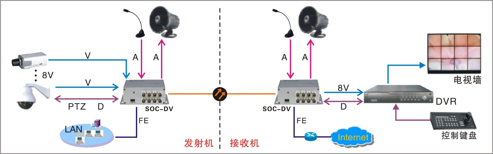 SOC-DV系列視頻光端機采用先進的數(shù)字視頻及光纖傳輸技術(shù),將視頻信號在單芯光纖上實時同步、無失真、高質(zhì)量地傳輸。此系列產(chǎn)品可根據(jù)用戶要求配置成多路雙向視頻、音頻、異步數(shù)據(jù)等業(yè)務(wù)。SOC-DV視頻光端機采用全數(shù)字視頻無壓縮傳輸技術(shù),高質(zhì)量的視頻效果可滿足用戶的需求, 安裝簡便易行, 無需進行現(xiàn)場調(diào)節(jié), 穩(wěn)定性高 。該光端機采用結(jié)構(gòu)模塊化設(shè)計,用戶可根據(jù)現(xiàn)場具體情況靈活選擇或定制配置,SOC-DV04/08系列視頻光端機板卡也可插入SOC-30JX19機箱中,19"集中式機箱直接上架,作為集中式視頻光端機業(yè)務(wù)板卡使用。